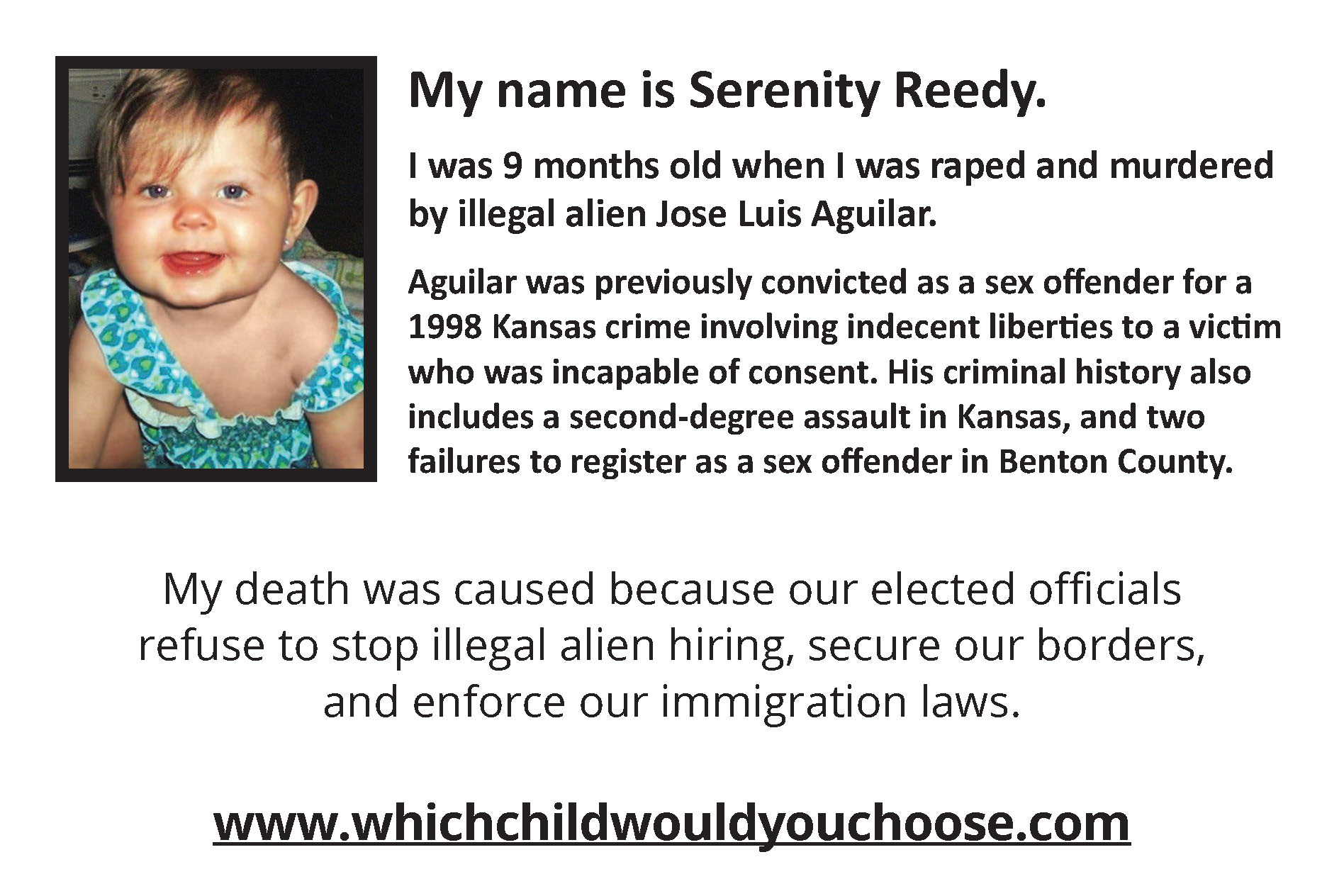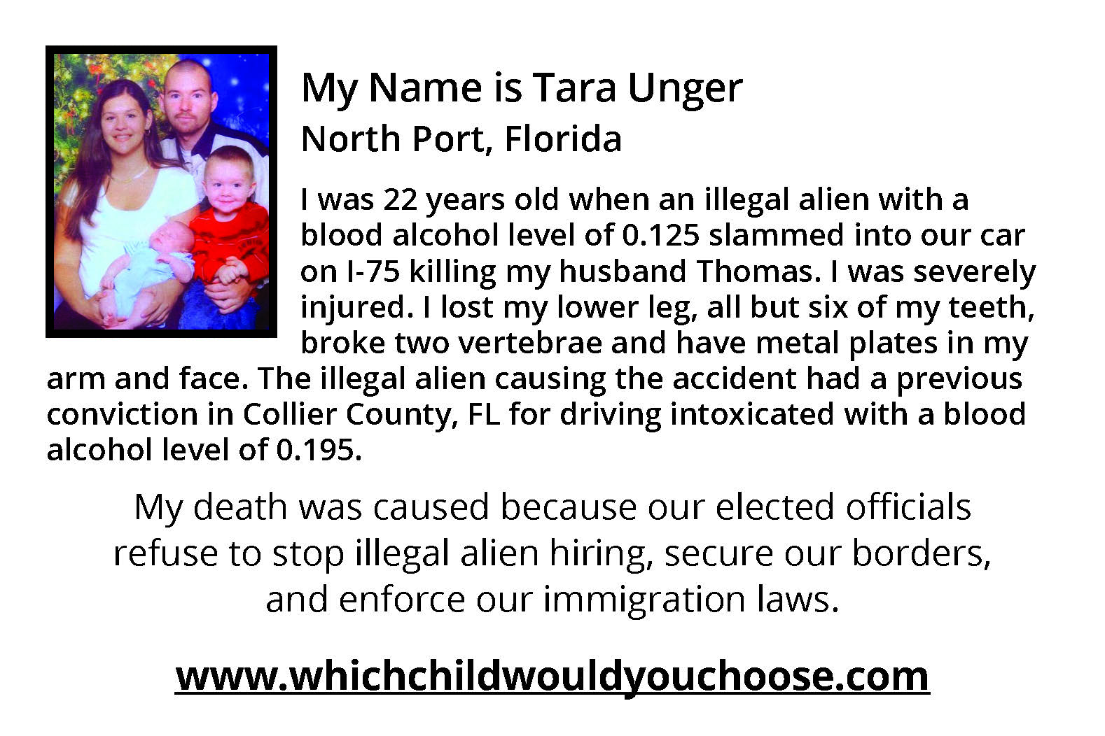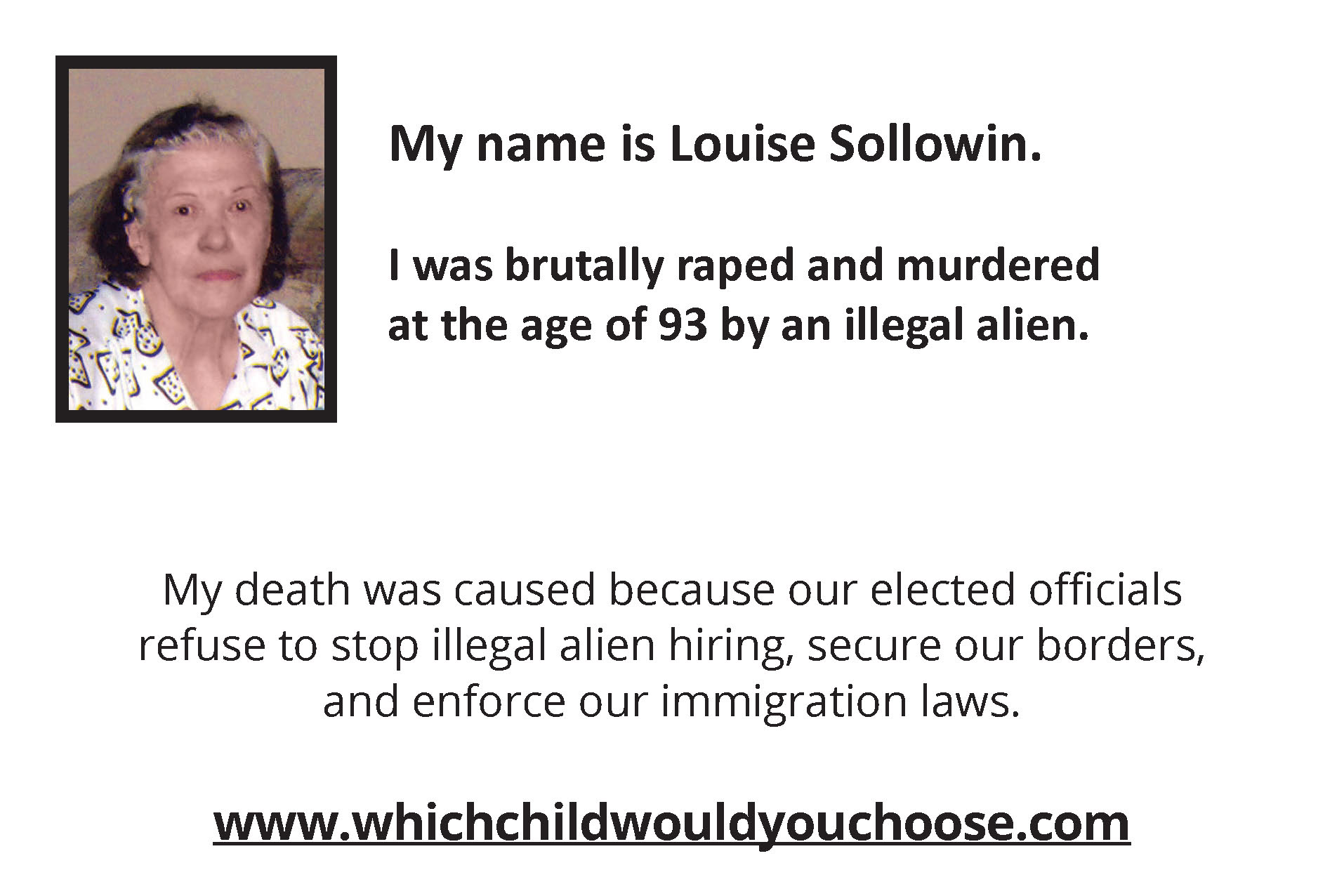 Which Child Would You Sacrifice If You Had To Choose? was written by an American mother with two sons and several grandchildren who was overwhelmed with sorrow and empathy for George & Laura Wilkerson and an untold number of families who have lost their precious loved ones to "preventable" illegal alien crimes occurring in America at an extremely alarming rate.