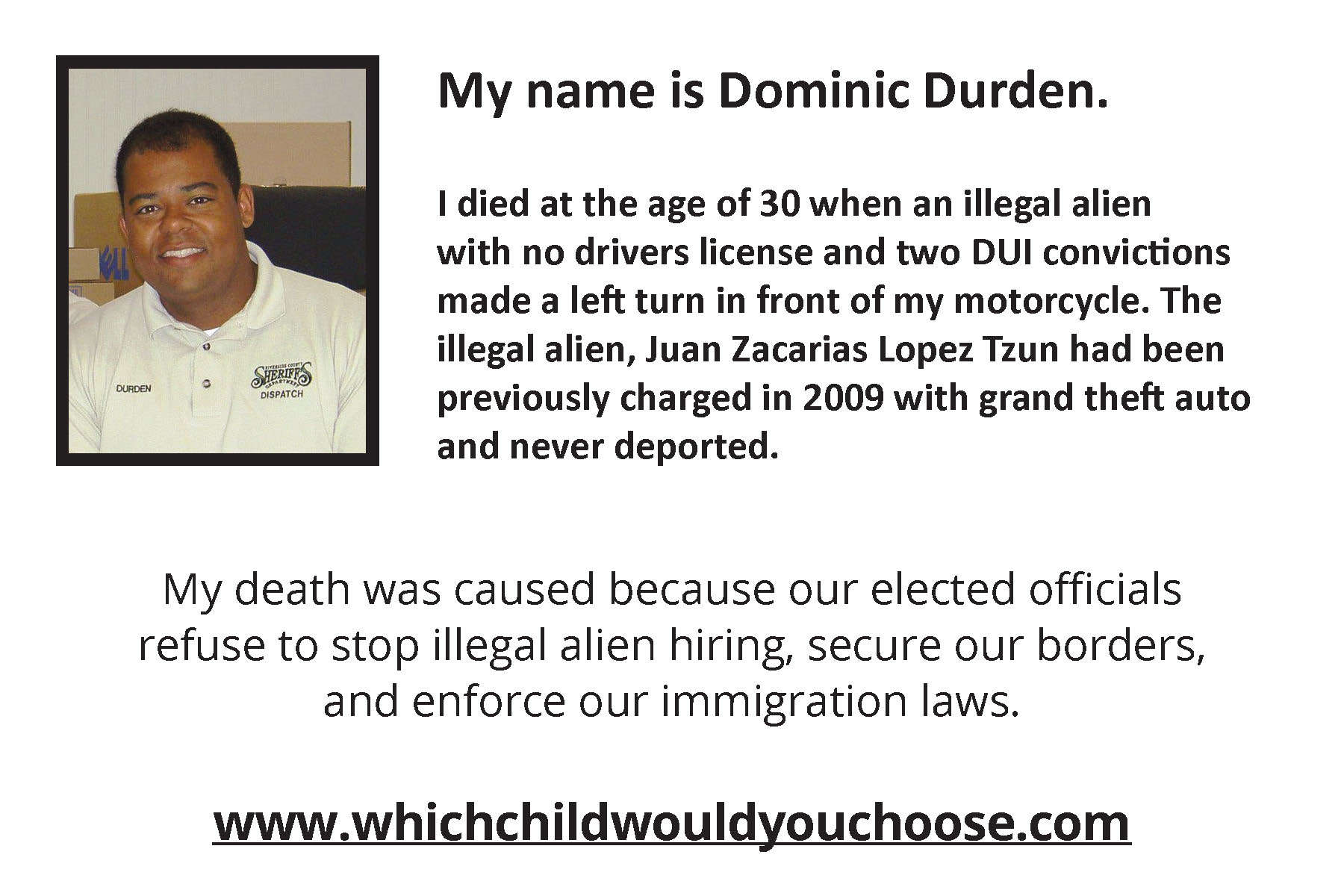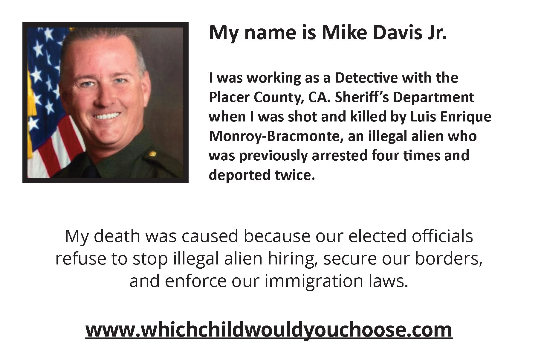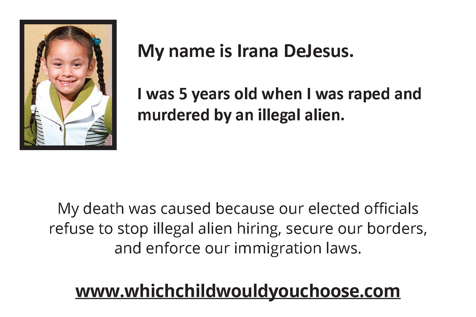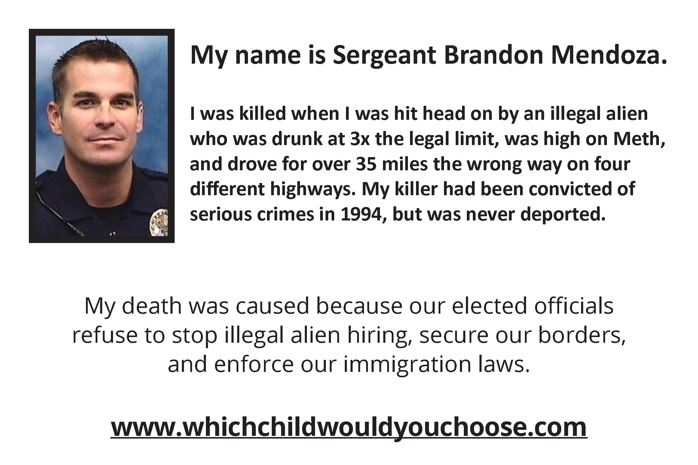 Which Child Would You Sacrifice If You Had To Choose? was written by an American mother with two sons and several grandchildren who was overwhelmed with sorrow and empathy for George & Laura Wilkerson and an untold number of families who have lost their precious loved ones to "preventable" illegal alien crimes occurring in America at an extremely alarming rate.