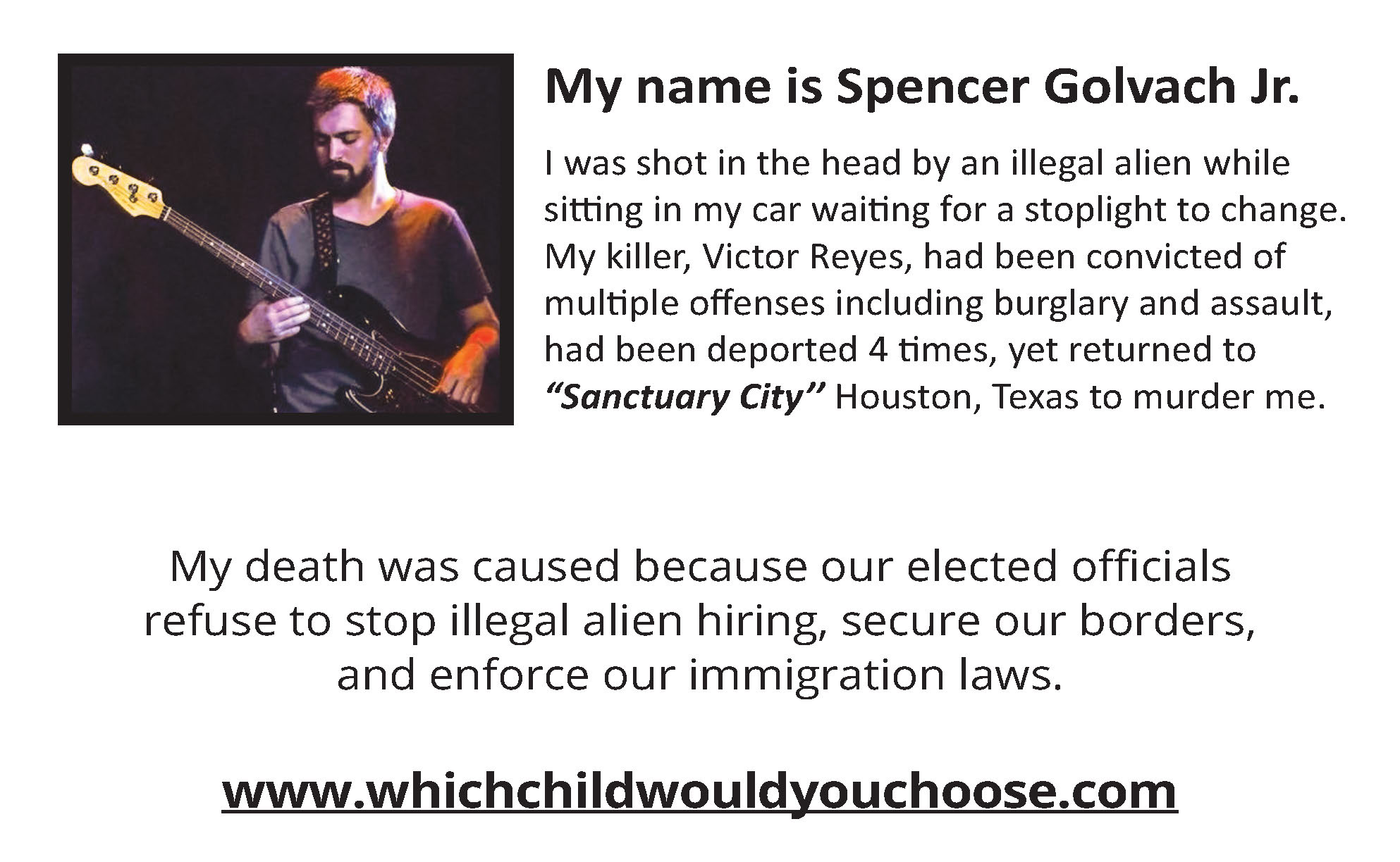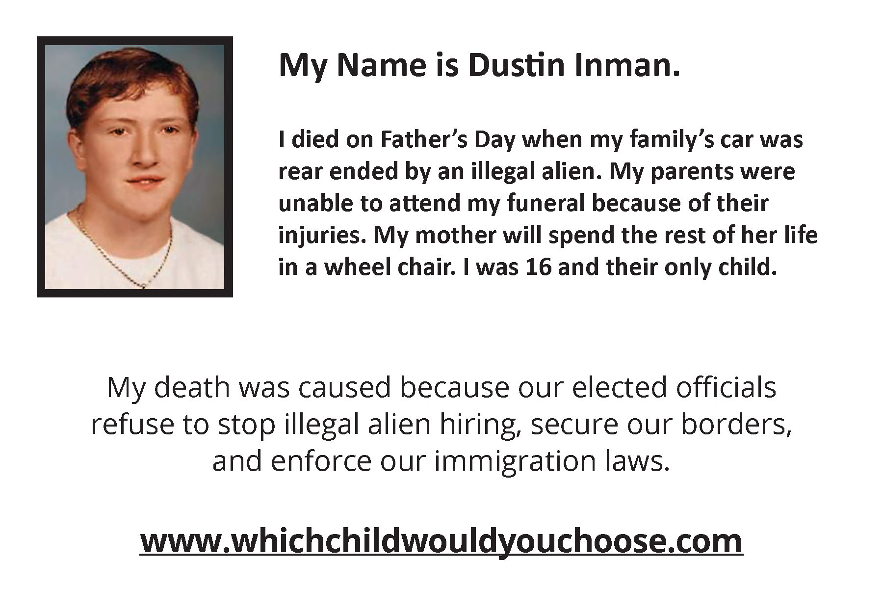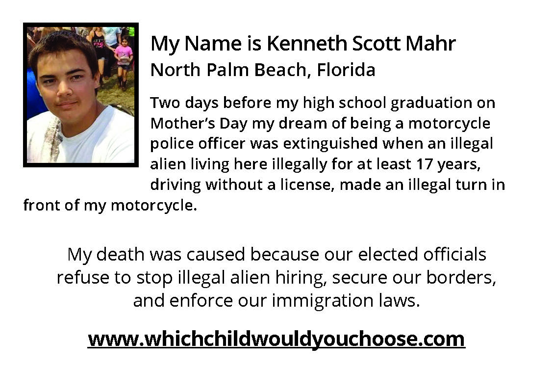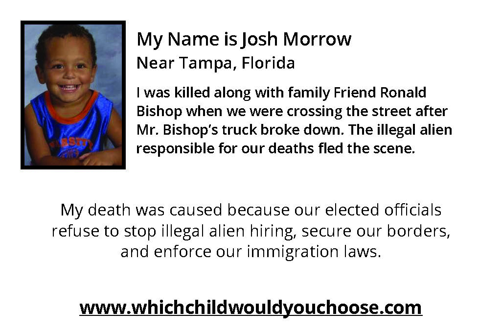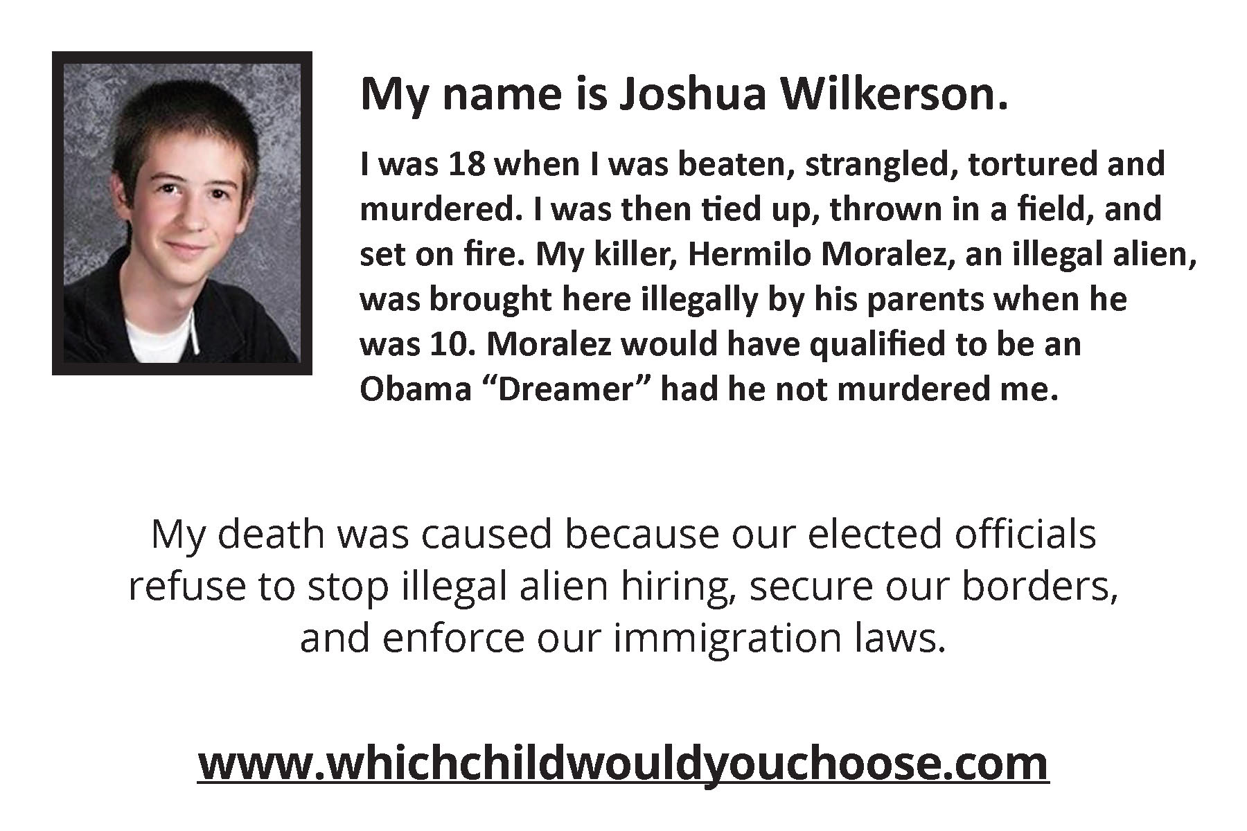 The Lyrics of were very specifically inspired by the heart-wrenching words Mr. George Wilkerson delivered at a Washington DC Press Conference arranged by Maria Espinoza of The Remembrance Project. George and Laura Wilkerson, residents of Houston, Texas are the grief stricken parents of Joshua Wilkerson, a high school student who was brutally and senselessly beaten, tortured and set on fire by an illegal alien "Dreamer" schoolmate. At that Press Conference, an emotional George Wilkerson challenged all Members of Congress to "Go home, gather up your kids and decide - Which one would YOU sacrifice to make a better life for someone else." The senseless loss of life of an innocent young American boy and the complete devastation of his parent’s lives had a resounding impact on this mother of two sons. She was compelled to pose that same question to the men and women in Washington who swore a solemn oath of office to protect Joshua Wilkerson and the tens of thousands of victims of "preventable" illegal alien crimes that have torn an estimated 50,000+ American families apart - permanently.